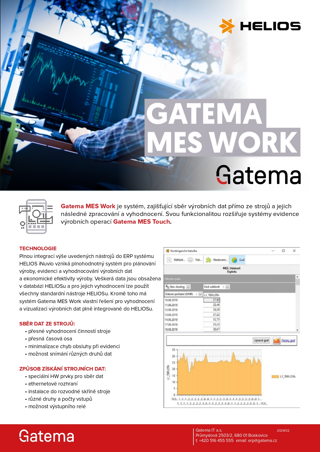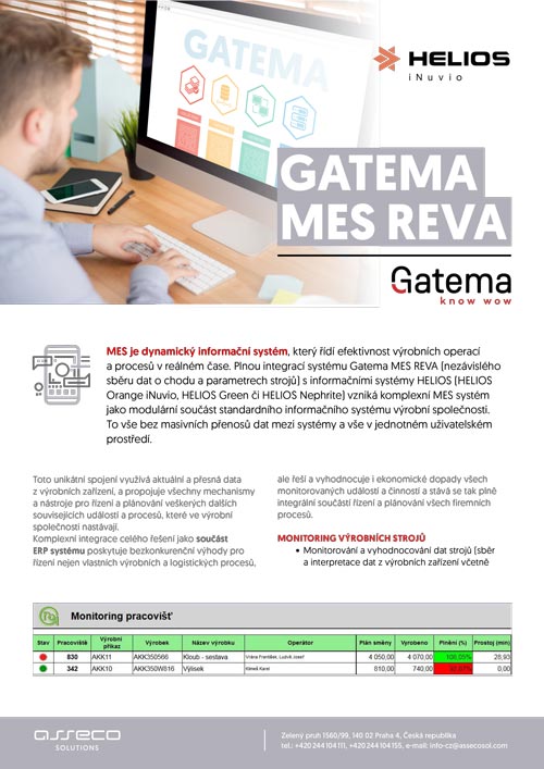 Manufacturing Execution System (MES) od Gativy představuje integrační řešení pro podnikové ERP systémy Helios. Díky Gativa MES dochází k efektivnímu propojení informačního systému a jednotlivých technologických zařízení ve výrobě.